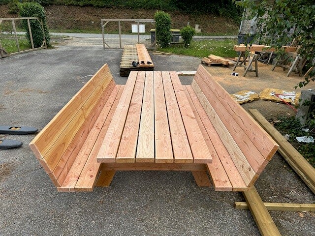 Table forestière avec dossiers pour un plateau de 3m de longueur/ 0,95m de largeur et 0.75m de hauteur pour 12 personnes à 660€